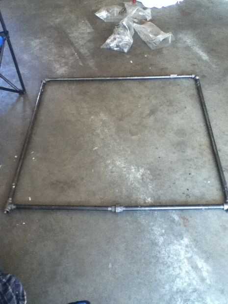 Inicio con el marco cuadrado. Comienzan en la parte superior conectando los codos y enroscar las tuberías verticales de 3 pies. Ahora juntar las patas de la estructura (no es foto de la brida del piso) ten en cuenta que las piezas de Unión y en 18 deben ir a la última!