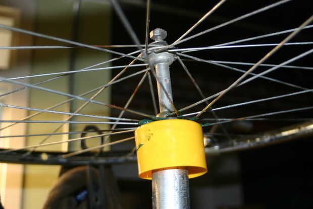 Bien, con nuestro sistema super-uber-simple el tubo grande termina frotando contra los rayos, y que es malo. Se rompen en pocos días, ya que todo gira sobre un eje. Por lo tanto, hicimos un cojinete para él. Lo hicimos de una tapa del desengrasante, que es bastante ridículo y eventualmente obtener reemplazará con algo más ridículo. Sin embargo, puede, poner más tiempo y pensamiento en esta parte de las cosas que hice.