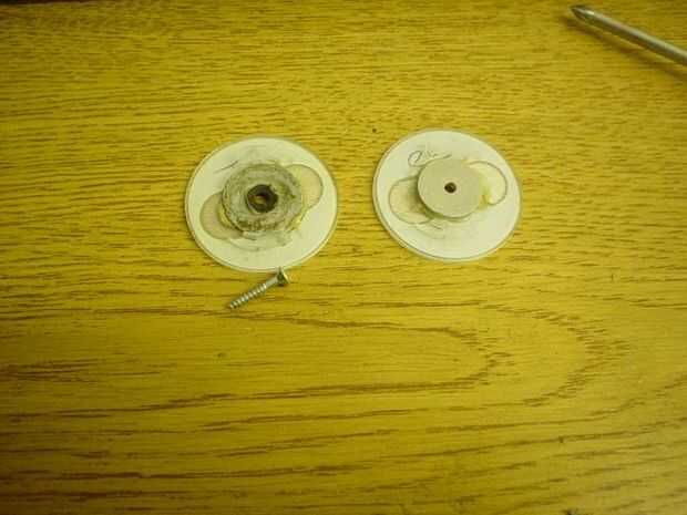 Se debe retirar el tornillo inferior en círculo desde el ratón. Pegar una arandela de centrado sobre el agujero de la parte inferior. (ver imagen) Deje que el pegamento secando.
