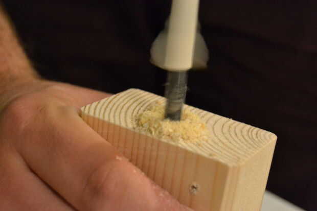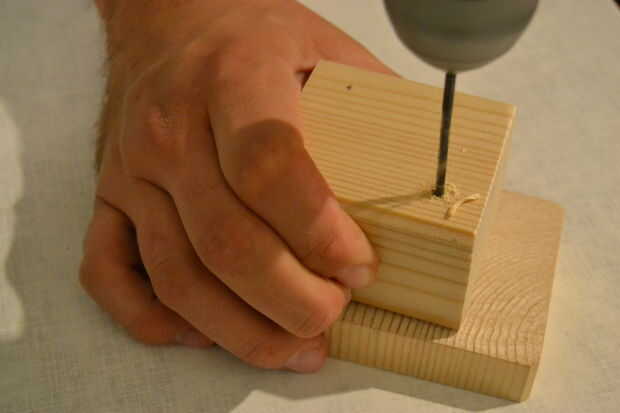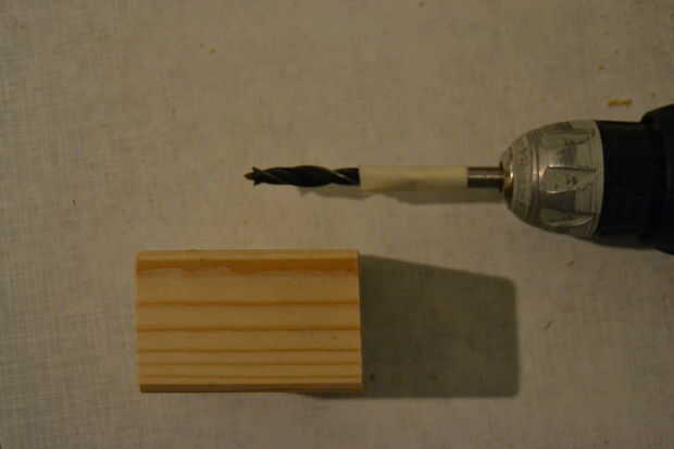 Ésos deben ser lo suficientemente grandes como para caber holgadamente la barra de acero en. Asegúrese de que hacer ellos en la misma altura en cada bloque, de lo contrario la barra de acero o los bloques de won´t ser más tarde. Para los bloques en los extremos del perchero sólo perfore a medio camino a través del bloque. Para el bloque en el medio, taladre a través de todo el camino.