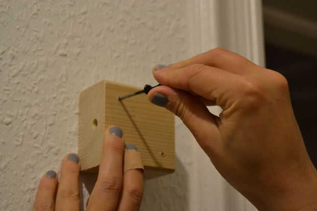 Ahora puede ya prueba-montar todo por la alimentación de la barra de acero a través de/en los orificios laterales de los bloques de madera. A menos que seas una diosa hindú con más de dos brazos, encontrar a alguien que sostenga hasta la pared, mientras se utiliza el nivel para encontrar la posición perfecta para fijar a la pared.