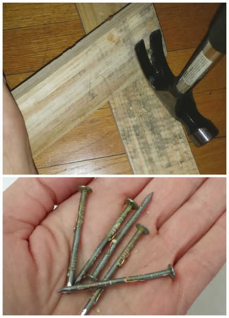 Mientras el taladro carga (!), hacer frente a los clavos en la madera de palet. ¿Ver las barbas de cobre? Trabajan. Estas cosas eran realmente dificiles de eliminar.