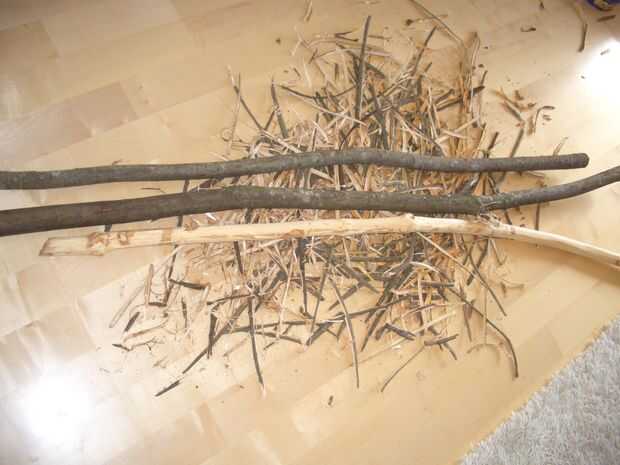 Preparar su rama cortando la corteza. Se utilizó un cuchillo suizo del ejército para ello. Luego corte la rama a la longitud deseada con una sierra de mano.
