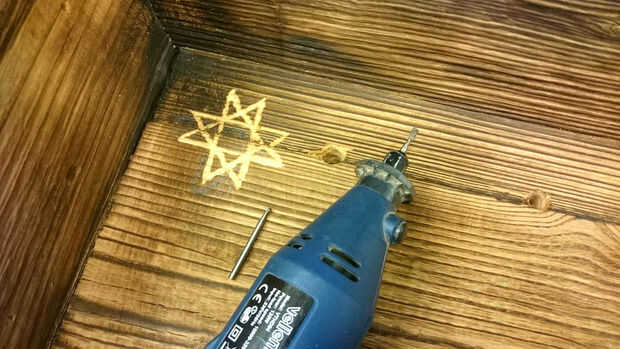 Justo antes de aplicar el aceite de linaza me decido a tallar dos símbolos en la capa de la rejilla. Utilicé mi herramienta de talla para esto. Este símbolo es ampliamente utilizado en Europa y los países islámicos y se supone para traer buena suerte. Uno nunca puede tener demasiada buena suerte ;)