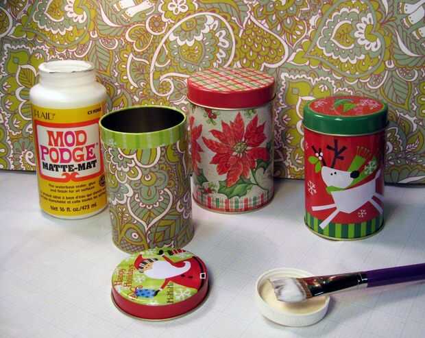 Vi que un montón de botes de lata con Navidad imprime en el recipiente de venta en la tienda de artesanía por menos de un dólar cada uno. Así, compré los cartuchos, algunas bastante papel de Origen del papely Mod Podge.