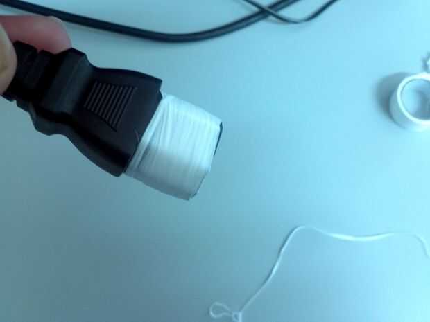 Algún tipo de teflon alrededor de la clavija del cable de la deformación, mina tomó cerca de 10 vueltas, después de que lo conecte otra vez y ver si es apropiado apretado, si no tratar de deformar un poco más cinta y prueba otra vez hasta que consiguió un ajuste apretado.