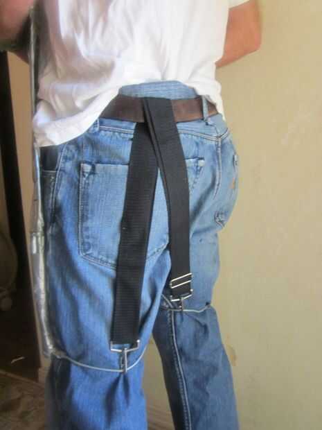 Mantener la estructura se caiga abajo tuve que encontrar una correa ajustable, que tenía clips en el extremo, mina estaba fuera una bolsa de lona. Cliped en círculos alrededor de mis rodillas, entonces circundó mi cinturón. Esto se mantuvo la estructura y funcionó a la perfección.