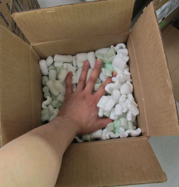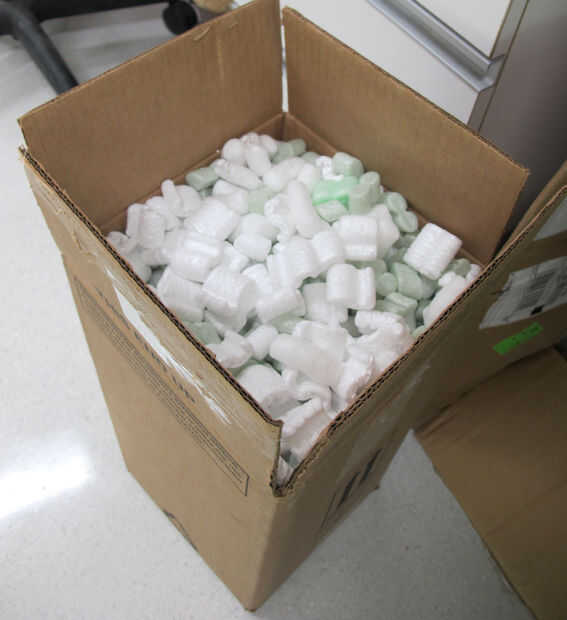 Yo había ahorrando hasta poliestireno cacahuetes del embalaje para un rato; básicamente en cualquier momento llegaron con algo que nos ordenó. Llenar la caja con los cacahuetes del embalaje y realmente jam en; Pude pegar de aproximadamente 1,5 x el volumen de basura de oficina estándar puede. De yapa también puede tirar en unos confeti o los agujeros del papel de la perforadora. Les aprenderá bien.