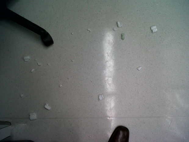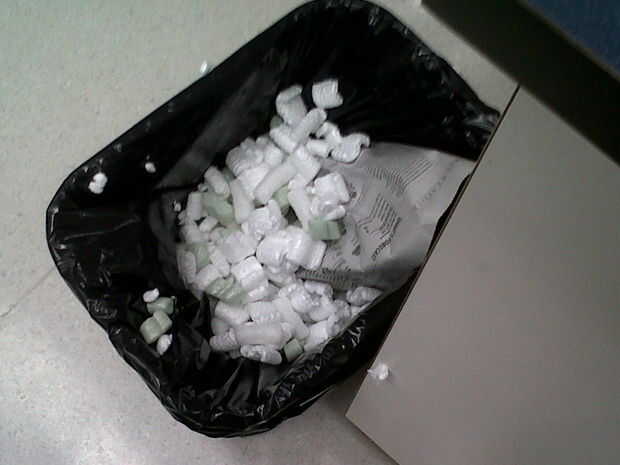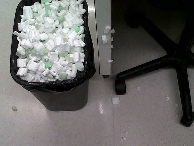 Papelera en escritorio de la víctima estaba completamente lleno. Como era el otro cubo que fue reclutado para el área de trabajo. Lo desagradable gordo de los cacahuetes del embalaje de espuma de poliestireno es cómo romper en pedazos minúsculos al pisarlas o aplastarlas. También tienen mucha estática y palo a todo: paredes, sillas, pantalones. Brillante.
