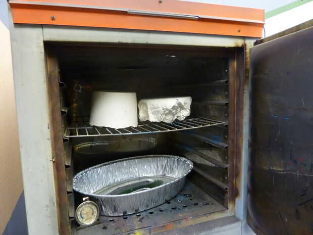 a pesar de que el molde de yeso parece seco, hay humedad atrapada en él. Para que se seque hacia fuera y pre-heat antes de derretir la cera a usar un horno convencional y aumente muy lentamente la temperatura. Calor sorprendente para que hará que el molde así que sea paciente. Siga mi siguiente instructable sobre quema la cera en el molde de yeso para fundición a la cera perdida para futuras instrucciones. ¡Que te diviertas!