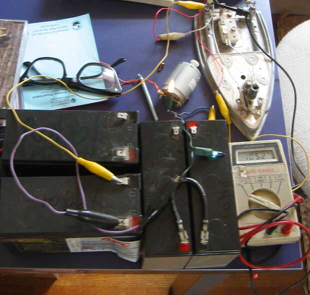 Aquí estoy utilizando dos bombillas en serie para limitar la corriente que va en un gelcell. Utilice el multímetro para medir qué corriente pasa por el foco a diferentes voltajes. O puede simplemente vaquero y uso una pequeña bombilla durante unos minutos, mientras que la sensación para ver si la batería se calienta o no.
