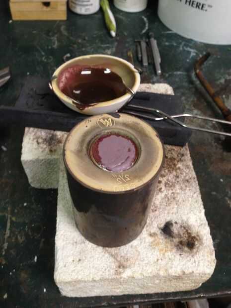 Utilice tenazas para tirar el frasco a y agujero para arriba de la Junta de la tabla del vacío. Mantenga quemando la plata fundida hasta que pierda tensión de superficie y verter en el agujero, mantener la llama sobre el metal todo el tiempo. Desea que la llama a una llama reductora (baja de oxígeno) para evitar oxidación que ocurre.