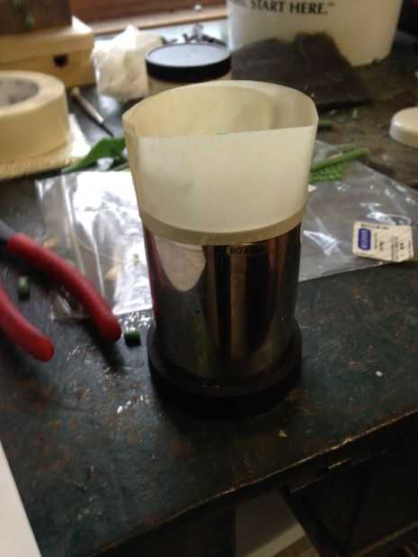 Cuidadosamente ponga el frasco en la goma base y poner un pedazo de cinta adhesiva en la parte superior del frasco. Esto evitará desbordamiento cuando desgasificación.