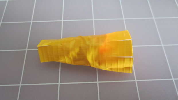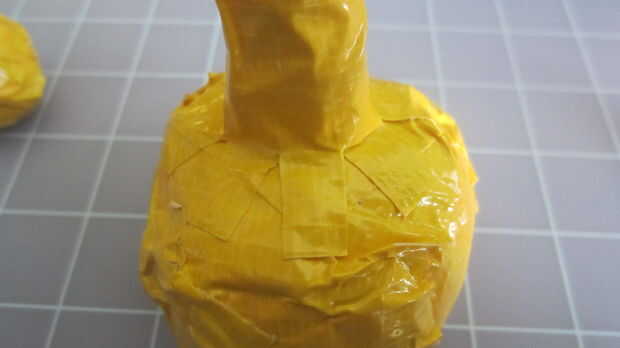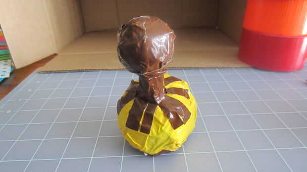 1) desechos rodados en una bola de 1 y 1/2 pulgadas de la cabeza. Rodillo a 3 pulgadas alrededor del cuerpo. El cuello de cuello 1 pulgada se enrolla como un conificado más ligeramente en forma en la que había cortado los extremos. Cuando balanceo utilizado cinta adhesiva para las partes del cuerpo, rodar la cinta firme pero no demasiado compacta. Todavía debe tener algunos dan para permitir para poder presionar de una forma si es necesario. Forma el cuerpo, el cuerpo comienza alrededor pero poco a poco hay dos lados que son ligeramente más planas. El fondo debe ser lo suficientemente plano para que el pavo pueda y ser estable. La parte posterior también debe ser ligeramente plana para permitir que la cola. Lisa baches por cinta de corte y cubriendo las piezas con cinta adhesiva marrón. * Tenga en cuenta que en la foto usé marrón y amarillo para que pueda ver mejor detalles.