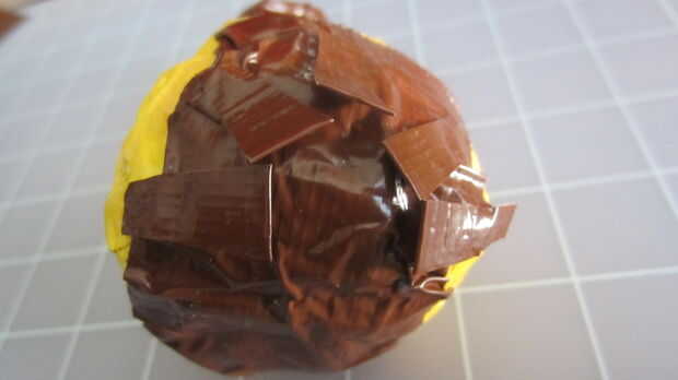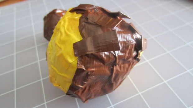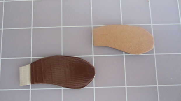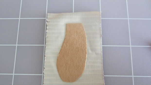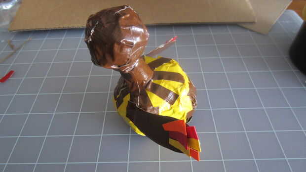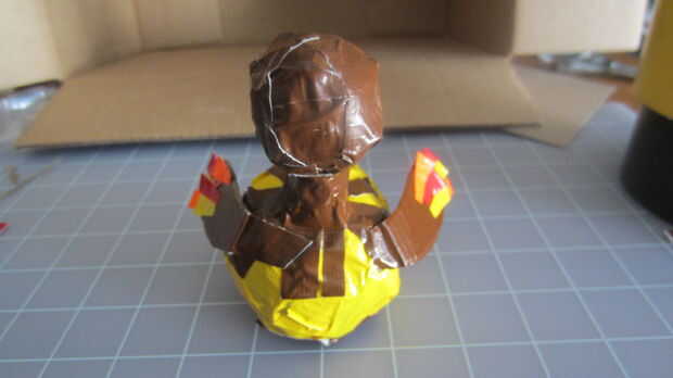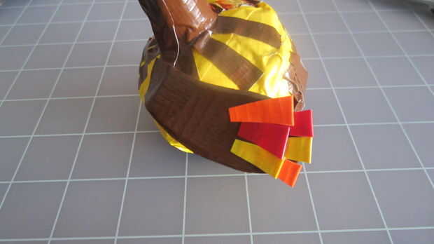 1) dibuje en cartulina y cortadas 2 alas en tamaño de 2 pulgadas x 1 pulgadas en la forma como se muestra en el cuadro 1. Que se forman un poco como una haba de jalea con un lado más pequeño que el otro lado. Usando cinta adhesiva marrón cubrir ambos lados de las alas y volver a cortar a la forma. Cintas usando marrón añadir las alas al cuerpo. Asegúrese de que sólo la parte delantera de las alas se graba hacia abajo para que el pavo tenga libertad para batir sus alas.