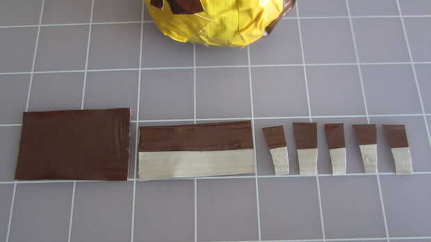 2) para hacer plumas corta cinta marrón 1 y 1 / 2 pulgadas de largo. Plegar a lo largo de un tercio de esa pieza para que quede sólo 1/3 de la muestra. Alargue la corte entonces verticalmente arriba y abajo las piezas para hacer aprox. 5 pedazos iguales. Para añadir una dimensión agradable a las plumas afilado las plumas por ligeramente cortando en ángulo los lados de las plumas, por lo que el lado pegajoso es afilado pero no demasiado sensible. Para las plumas marrón, necesita plumas individuales de 150-200. Pero los hace a medida que avanza. (Foto 3)