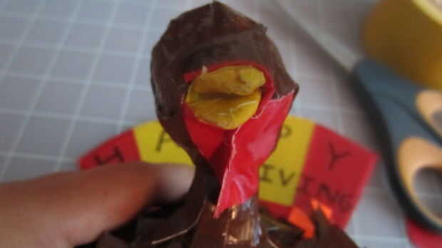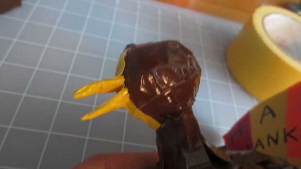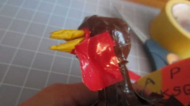 Cinta amarilla del uso 1) crear el pico superior e inferior. Ambas piezas son de forma triangulares y es poco 3/4 pulgadas de largo. Coloque tiras de cinta de conducto de pico en la cara de Turquía usar amarillo.