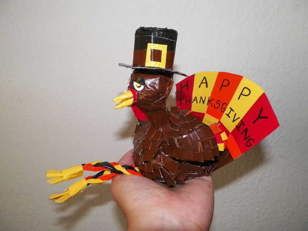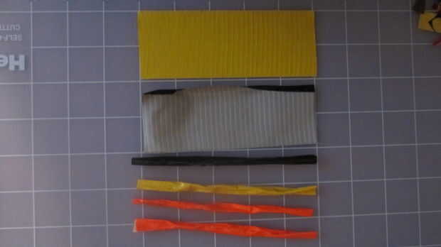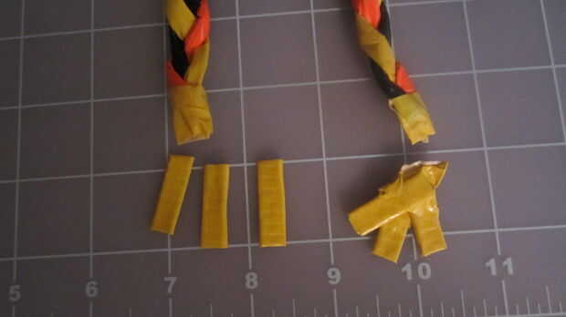 1) cortar 2 piezas de cinta adhesiva tiras de 6 pulgadas en negro, naranja y amarillo. Rodar en una tira larga delgada y crujir ligeramente juntos. Poner fin a uno de cada color con un pedazo amarillo de cinta cinta en ti. Trenza los 3 colores y al final de la cinta con marrón pedazo de cinta adhesiva. Lo mismo para la otros 3 cinta crear otra pierna o pavo.