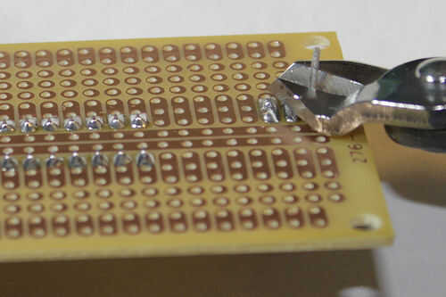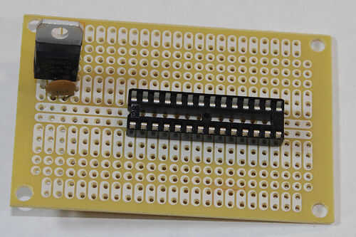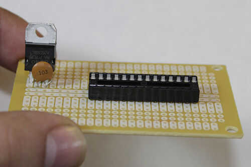 LM7805 circuito va siguiente. El 7805 le permite apagar el circuito con una batería de 9v o incluso fuente de alimentación de 12v DC y salidas 5v, que es lo que quiere nuestro chip. Con la "silla" mirando hacia usted, soldar el capacitor de 10nF conectando las patas derecha dos del 7805. En esta posición, de izquierda a derecha, las clavijas son de