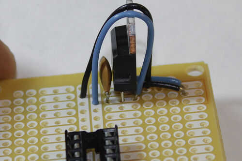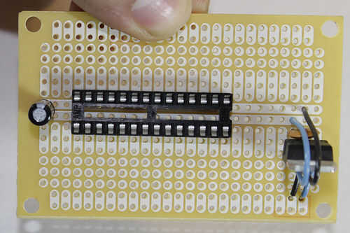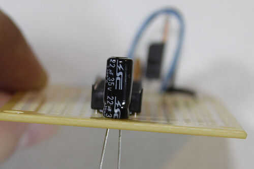 Por último, instale el el capacitor de 22uF a través de las líneas de energía en algún lugar después el chip ATMega. En este caso estoy poniendo al final de mis carriles de la energía. Ten en cuenta de la polaridad al usar condensadores electrolíticos - emparejar el terreno de la PAC para el carril de tierra. Esto es importante!