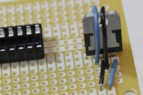 Circundar el 7805 en cualquier lado. Por el centro de la perfboard puedes ver los dos carriles que van hacia abajo el centro del tablero, que estoy usando como carriles de la energía (similares a los carriles exteriores de un protoboard). He elegido uno a moler, el otro ser la alimentación (+ 5v).