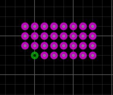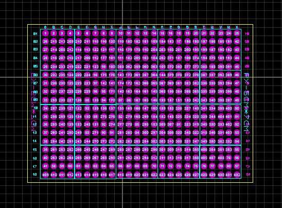 Aquí quiero diseñar un estándar 5 * 7cm (2 * 2.75 ") perf que es una 24 columnas (A X) 18 filas (01 al 18) cojines con un espacio entre ellos de 2,54 mm (0,1"). Primero pongo los 432 cojines (círculos de 80) usando la red de 2.54 milímetros. A continuación dibujo el borde del tablero y la etiqueta de filas/columnas en parte superior e inferior (no olvides hacer un espejo eje x para el texto de seda inferior). Esta placa tiene alguna zona cuadrada en la parte superior para terminar dibujando los.