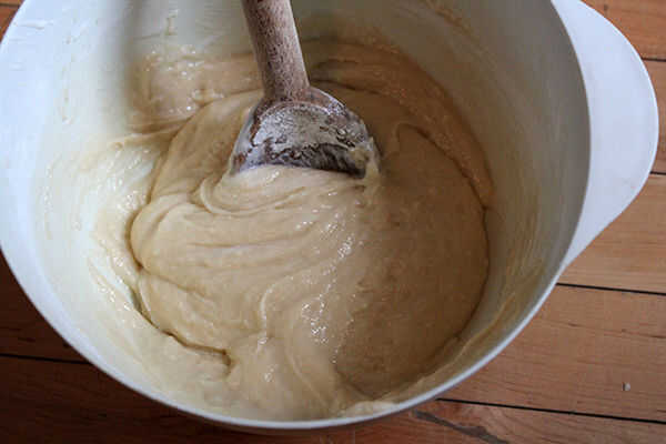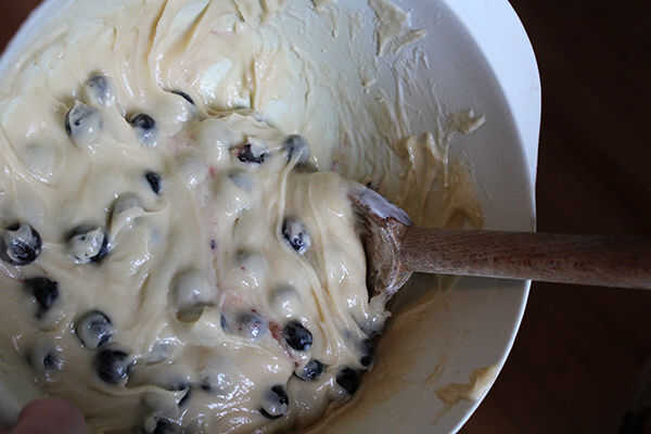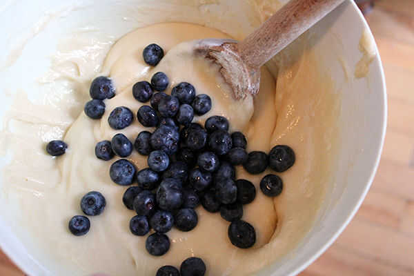Es importante que todos sus ingredientes se combinan bien antes de mezclar en los arándanos. Desea utilizar un revuelo o dos para mezclar en los arándanos, de lo contrario, terminarás con bayas machacadas y masa púrpura.