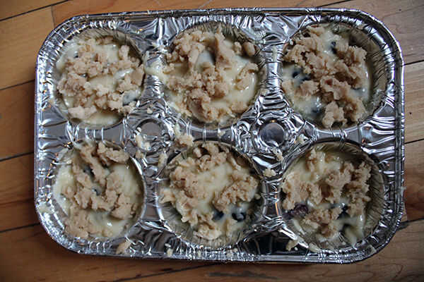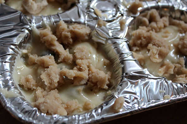 Vierta la mezcla en los recipientes hasta que estén sobre 2/3rds completo. Les corone con una buena capa de la crumble de azúcar.