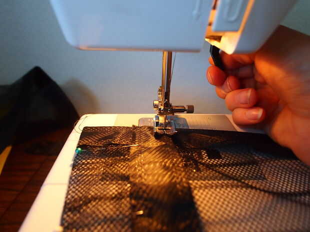 Con la aguja hacia abajo, levante el pie prensatelas y gire la malla de 90 grados. Coser la parte superior de la tela fijada para arriba hasta llegar a la primera línea oscura. * Si su producto no dispone de estas ingeniosas líneas que tendrás que medir y marcar el espacio de los bolsillos.