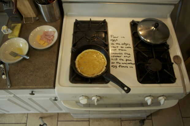 Una vez que comienza la cocción, retire los bordes del lado de la bandeja hacia el centro e inclinar la sartén para que el huevo crudo fluye en.