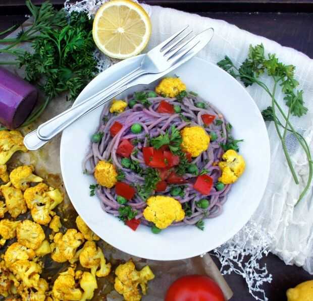 Había convertido al aderezo diosa púrpura en una salsa de pasta cremosa y había emparejado con guisantes brillantes, joya-como tomates y hermoso sol brillante coliflor asado de cúrcuma.