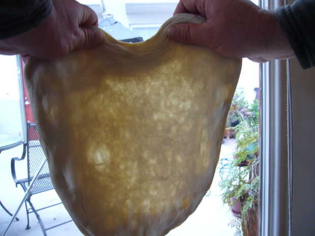 a mano estiramiento sostenga el borde de la masa y que la gravedad tirar de la masa hacia abajo. Gire la mano en el borde. Mantener hasta la luz y agarrar las secciones más gruesas y separe un poco.