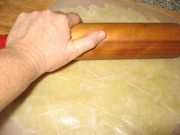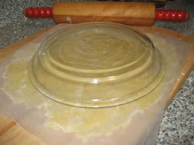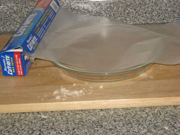Estirar desde el centro, girando su corteza de papel cubierto con cada una o dos pasadas de rodillo, hasta formar un círculo ligeramente más grande que el plato de pastel. De vez en cuando durante este proceso, voltear el papel había cubierto corteza. Retire el papel hasta que no se peguen. Si comienza a pegarse, polvo arriba de la corteza con un poco de harina. Sustituir el papel y continuar a tamaño. Si su masa es de la consistencia correcta, no será necesario enharinar.