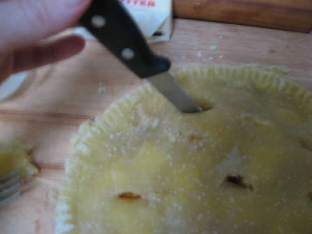 (Un método más fácil es presionar firmemente con un tenedor uniformemente alrededor del borde de la placa entera y quitar exceso de masa saliente con un cuchillo. Por desgracia, este es el método que utiliza, como en la creación de este Instructable, permitió a la costra de pastel se seque hacia fuera demasiado para hacer un borde decorativo.)