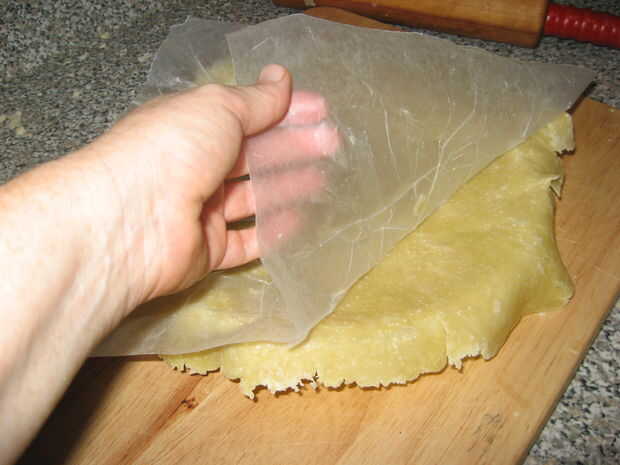 Retire la capa superior de papel encerado de la masa enrollada hacia fuera. Gire suavemente sobre la corteza (por lo descubierto es hacia abajo) y suavemente se pone en tartera, centrándolo para caber uniformemente. Quitar la capa superior de papel de cera.