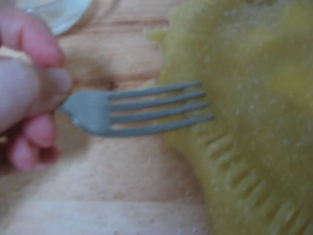 Sellar el relleno entre las dos capas de la corteza y doblar la masa colgante juntos. Pasteles entre el pulgar y primer dedo en ángulo al borde de la masa para crear un borde decorativo de la encrespadura.