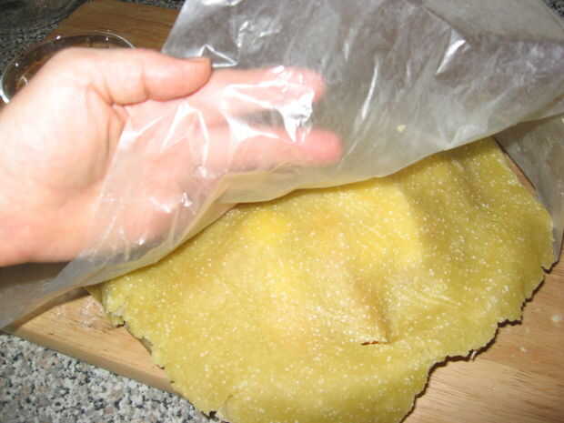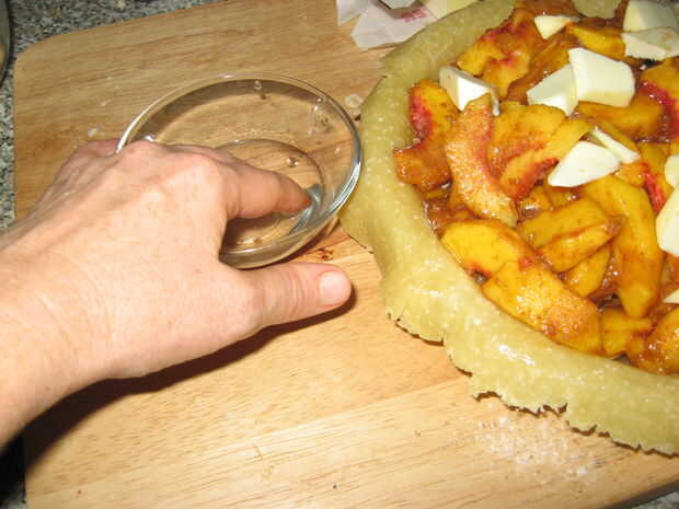Humedezca el borde de la corteza corriente el dedo sumergido en el agua alrededor del borde de la corteza entera. (Esto sellará las dos capas juntas.)