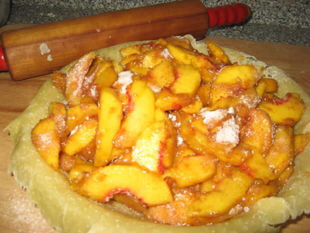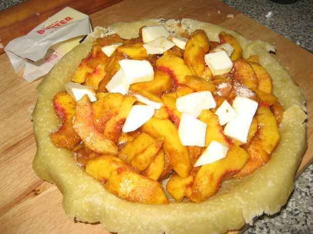 Relleno de durazno pastel vierte en corteza forrado placa. Corte 3 cucharadas de mantequilla en trocitos y pedazos de mantequilla punto encima del relleno.