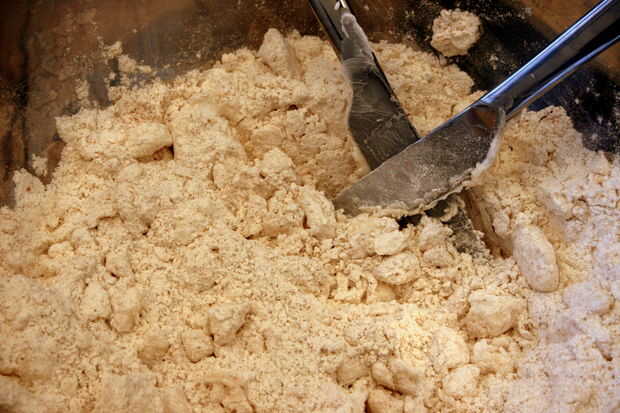 Corte en los ingredientes secos con un cortador de repostería o dos cuchillos hasta que los trozos pequeños de manteca son no más grandes que los guisantes.