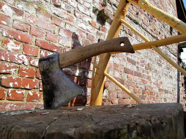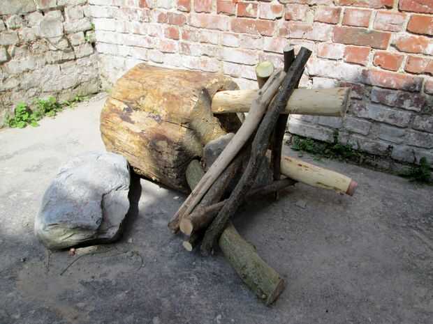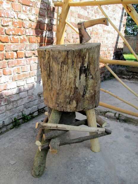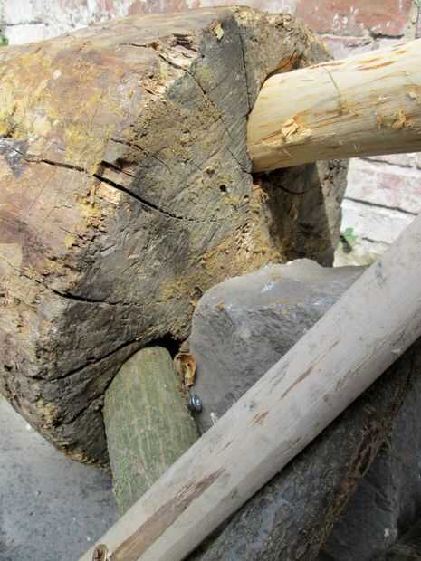 De hecho, es sólo un trozo de acacia (una especie bastante pesada) que planteado mediante la adición de tres patas. Para poner los postes había perforado unos agujeros con un taladro de reloj, inserta los polos y había ligado junto con pequeños palos. Una piedra pesada fue insertada para más estabilidad.