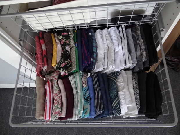 Se me ocurrió la solución perfecta: doblar la ropa en paquete muy pequeño, compacto y colocarlos horizontalmente!