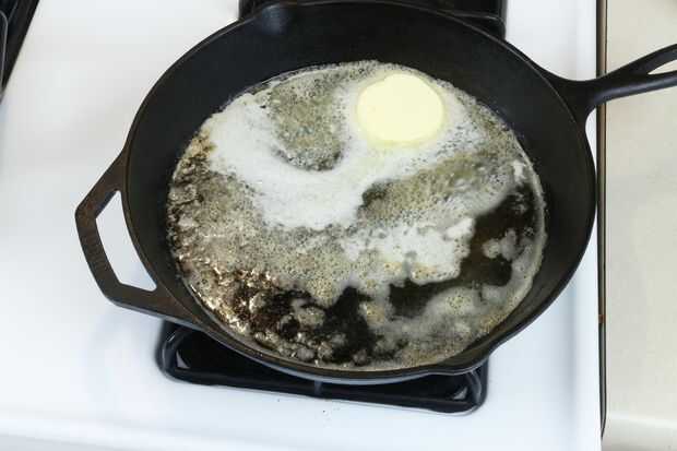 2) derretir grasa de tocino o mantequilla en la sartén, lo suficiente para cubrir el fondo de la sartén por 1/4 de pulgada.