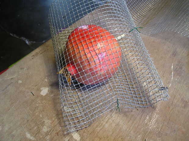 Rodean la fruta con el alambre y el molde se cerró con las manos. Utilice el cable como en el paso anterior para cerrar la jaula alrededor de fruta.