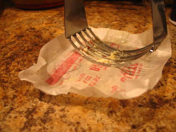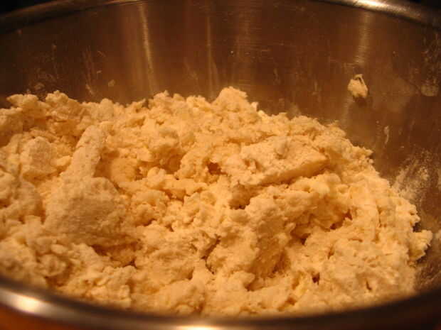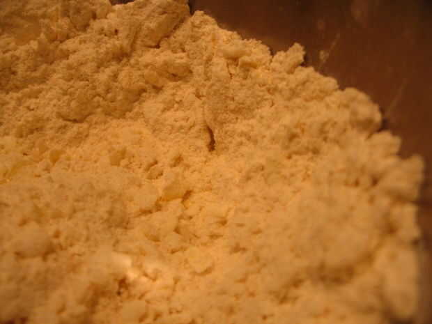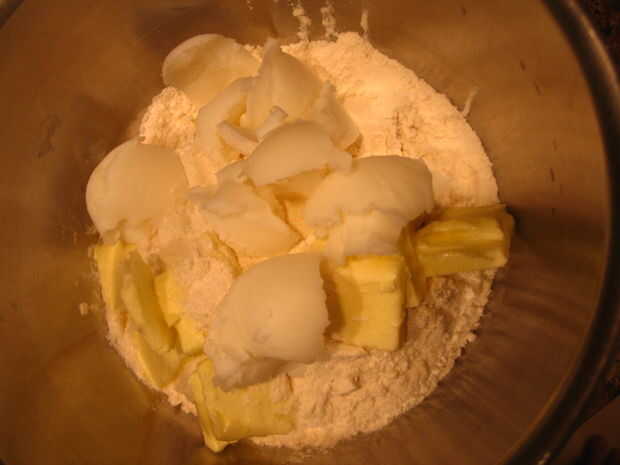 • Luego tienes que cortar en la mantequilla y la manteca de cerdo... para esto que me gustaría correr el cortador de pastelería a lo largo del lado del tazón de fuente en el centro de los ingredientes, luego que tire hacia fuera girando ligeramente el recipiente y repetir hasta que los ingredientes forman pequeños grumos de tamaño de un guisante.