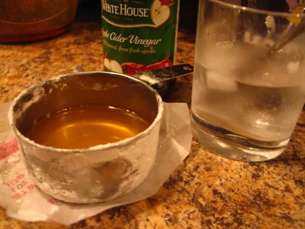 • En un tazón pequeño o taza de medición mezclar el vinagre con 5 cucharadas de agua de hielo y luego córtalo en la mezcla de harina. Si la masa está muy seca, agregar los restantes 2 cucharadas de agua. Combine los ingredientes hasta que un puñado de masa sólo pega cuando se aprieta ligeramente, pero son todavía capaces de ver trozos de mantequilla mezclar en la masa (esto será especialmente evidente cuando se hace rodar la masa).
