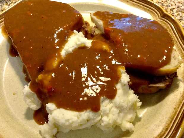 Coloque una cucharada grande de puré de patatas entre las 2 mitades del sandwich. Vierte la salsa sobre la parte superior de mitades de sandwich y puré de papas.