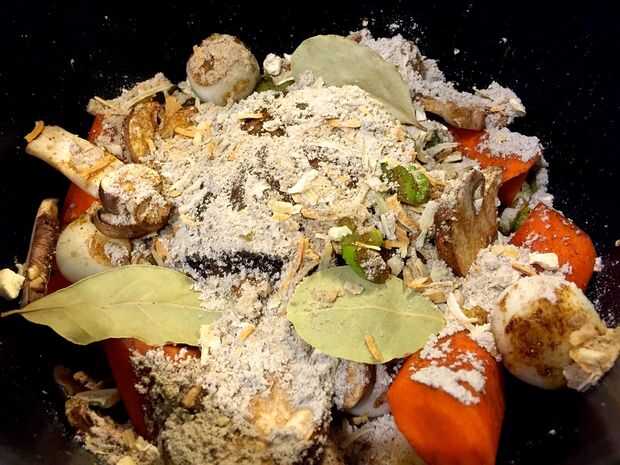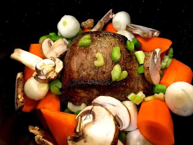 Colocar el asado en una parrilla en la olla a presión. Luego, añadir las zanahorias, apio, cebollas perla, setas, hojas de la bahía y sopa mezcla.