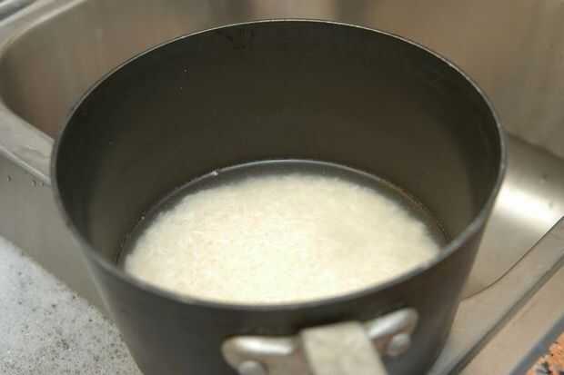 Ahora se enjuague bien el arroz. Generalmente encuentro que llenar la olla con agua, el arroz alrededor se arremolinan y drenando el agua hacia fuera tres veces es suficiente. Quieres el agua para ser clara y libre de la nubosidad con almidón se notan en la primera foto.