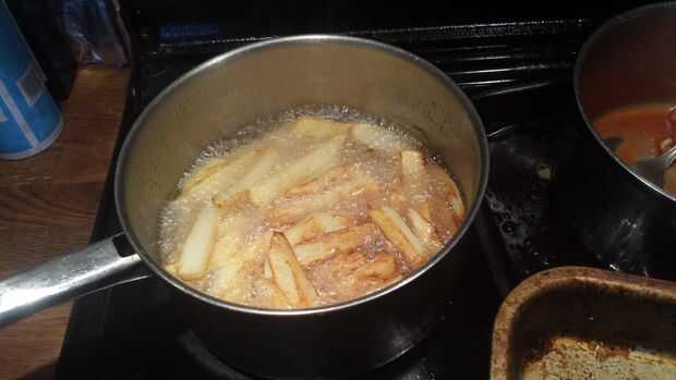 Tomar un cazo vacío y colocar el colindar metal encima de la bandeja. Retire la cacerola de la viruta del fuego y vierta cuidadosamente el aceite en la bandeja vacía. Dejando las fichas cocidas en el colindar.