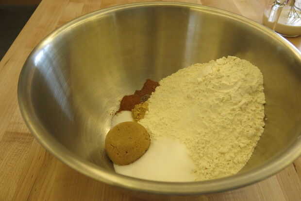 En un medio a un tazón grande combine la harina, azúcar, sal y especias y revuelva para combinar.